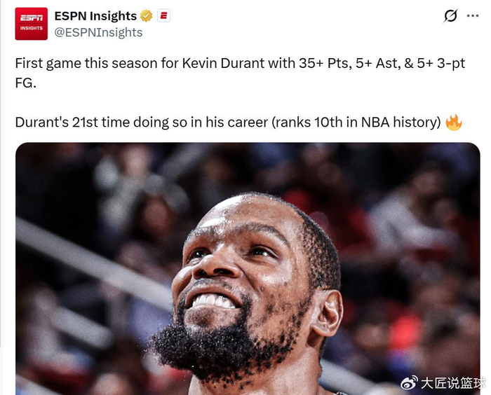 同时本场是杜兰特加盟火箭之后,首次单场拿到至少35+5助攻+5三分,也是其生涯第21次,位列NBA历史第十。