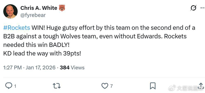 正如赛后火箭媒体人Chris A. White所说:“在背靠背第二战,火箭队击败了强敌森林狼,全队展现出巨大的勇气和拼劲,杜兰特轰下39分,拿下了一场急需的胜利。”